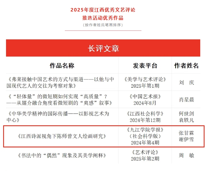 近期,由江西省文联主办,省评协承办的2025年度江西优秀文艺评论推选活动已完成评审。全省评选出10篇优秀文艺评论,我校教师张甘霖、谢伊雪的作品《江西诗派视角下陈师曾文人绘画研究》入选,该作品原载于2024年第4期《九江学院学报》(社会科学版)。 此次推选活动是加强和改进全省文艺评论工作、落实省委文化体制改革专项小组关于深化文化体制机制改革要求的重要举措之一,旨在建立文艺评论引导激励机制,强化价值引导、激发创作热情、建强评论赣军,对于促进我省文艺评论事业繁荣发展具有积极意义。